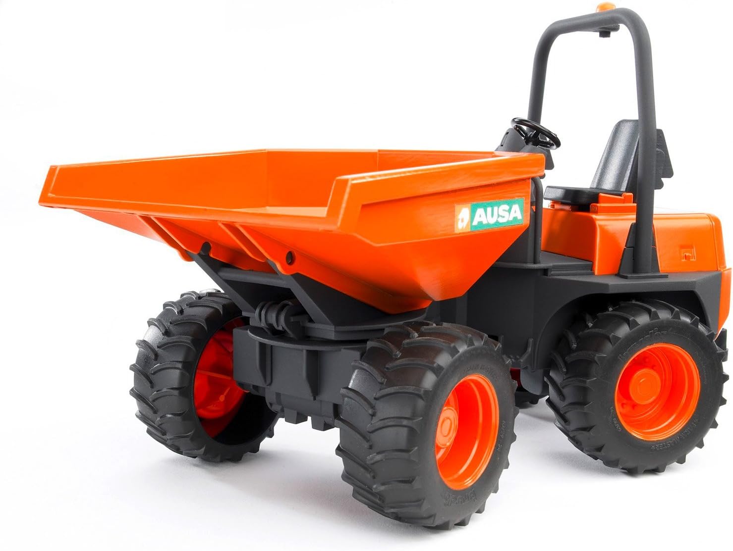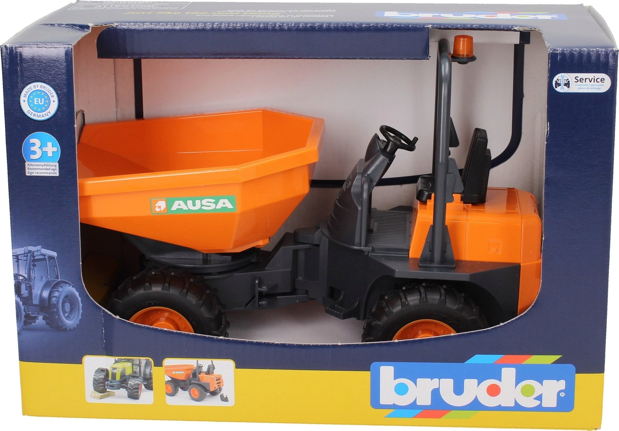 BRUDER supplements its highly successful range of small constructionvehicles with a so-called mini dumper. Mini dumpers are usuallycompact machines with articulated joint steering which are capable oftransporting loads of up to 4 tonnes across uneven and hard-to-accessterrain. Thanks to their four-wheel drive and articulated jointsteering, they are highly manoeuvrable and capable of keeping all oftheir four wheels on the ground at all times. This new BRUDER modelis modelled on the Dumper D 350 AHG made by the Spanish firm AUSA.Just as its real-life brother, the BRUDER dumper is equipped witharticulated joint steering and a tipping trough that can be rotatedand has great off-road capabilities like its original. The vehiclecomes with a rear coupling which allows it to be combined withnumerous towed vehicles out of the BRUDER product range.