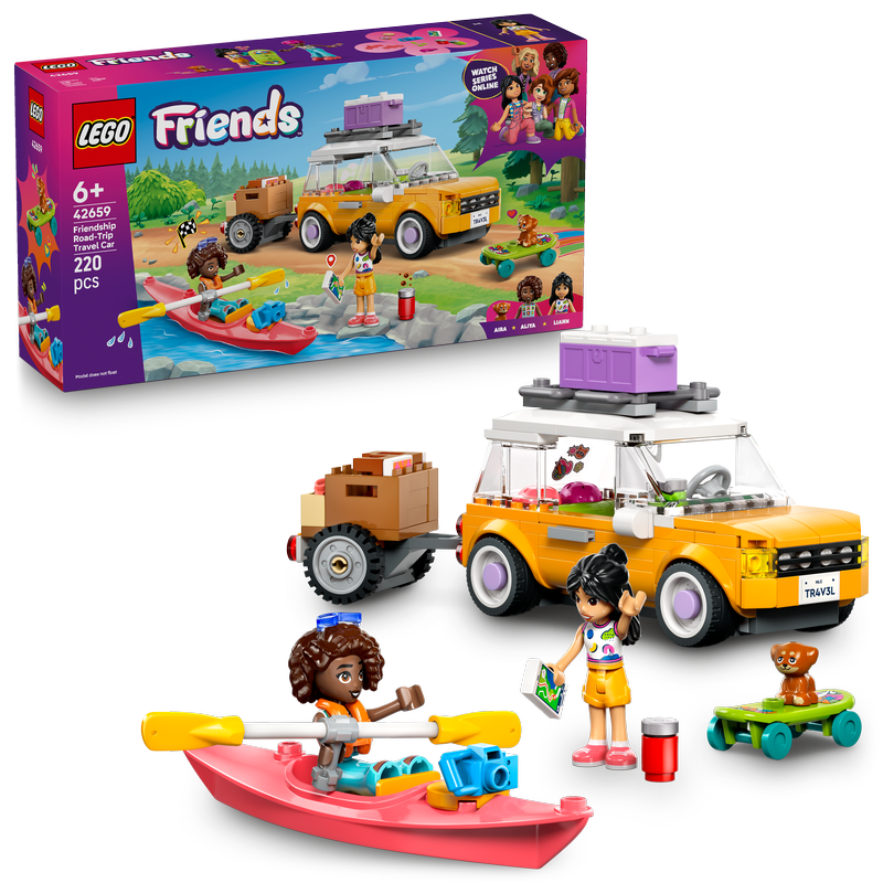 Open up a world of adventure for kids with the LEGO® Friends Friendship Road-Trip Travel Car (42659) building set for girls and boys aged 6 and over. This action-packed set includes a car with a trailer, 2 LEGO Friends minidolls, a cute puppy figure and lots of accessories to fuel fun playtimes. Take kids on a journey of creativity as they help Liann and Aliya pack the car and removable trailer with everything they need for their road trip. The friends sit in the front, and there’s a seat for Aira the dog in the back. Accessories include a kayak, 2 helmets, a skateboard, in-line skates, 2 chairs and a cool box containing a sandwich, doughnut, biscuit, cherries and a pet treat. When it’s time for a snack, the cool box doubles as a picnic table. Discover more social-emotional building toys (sets sold separately) in the LEGO Friends universe. This set comes with the LEGO Builder app for intuitive building. Here kids can zoom in and rotate models, save sets and track progress as they build." A kids’ building set packed with pretend-play inspiration Buildable LEGO® vehicle with trailer, kayak and cool box Includes 2 minidolls and a puppy figure Accessories include a kayak, a skateboard, in-line skates, a cool box and more A fun gift for kids who love friendship-based role play Discover more LEGO® sets (sold separately) and the LEGO Friends online series The LEGO® Friends range lets kids create their own imaginative stories A 220-piece set with a car and trailer measuring over 19 cm (7.5 in.) long