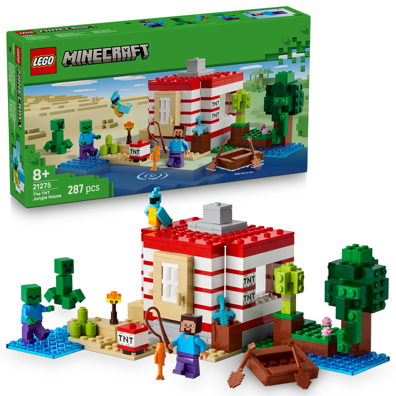 Give Minecraft® players and fans an explosive treat with this fun and creative toy. The TNT Jungle House (21275) is a versatile gamer gift for kids aged 8 and over with a passion for adventure toys, video game decor and Minecraft action and adventures. The buildable house is set in the Minecraft jungle biome and looks like a large-scale version of the game’s iconic TNT element. A switch on the side lets kids trigger an exploding TNT function, which collapses the entire house. When the dust settles, kids can rebuild the house so it’s ready for their next adventure. Steve, Creeper™ and zombie minifigures inspire imaginative play and battle action. Authentic LEGO Minecraft accessories include a boat, fishing rod, fish, parrot and jungle foliage. The LEGO® Builder app gives kids the added fun of using their device to zoom in and rotate models in 3D. Contains 287 pieces." There’s exploding TNT action in this build-and-play video game collectible merch Includes Steve, Creeper™ and zombie LEGO® Minecraft® minifigures Kids can pretend to battle mobs and build a TNT-shaped house that can blow up A switch triggers an explosion that collapses the house’s ceiling and walls Birthday gift for girls and boys and video gamer kids who love Minecraft® Compatible with other toys (sold separately) in the LEGO® Minecraft® range LEGO® Minecraft® building toys give kids another way to enjoy creative gaming This 287-piece set measures over 10 cm (3.5 in.) high and 24 cm (9 in.) wide
