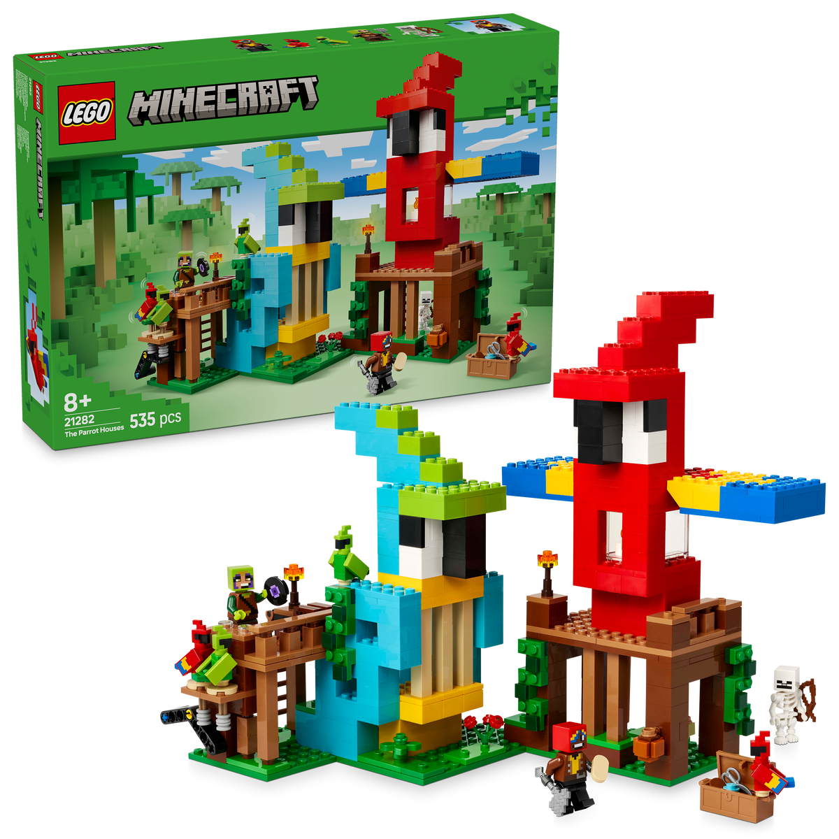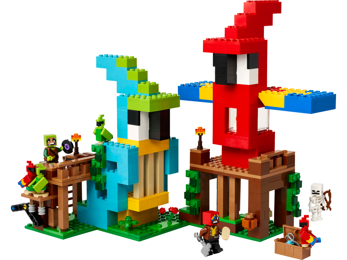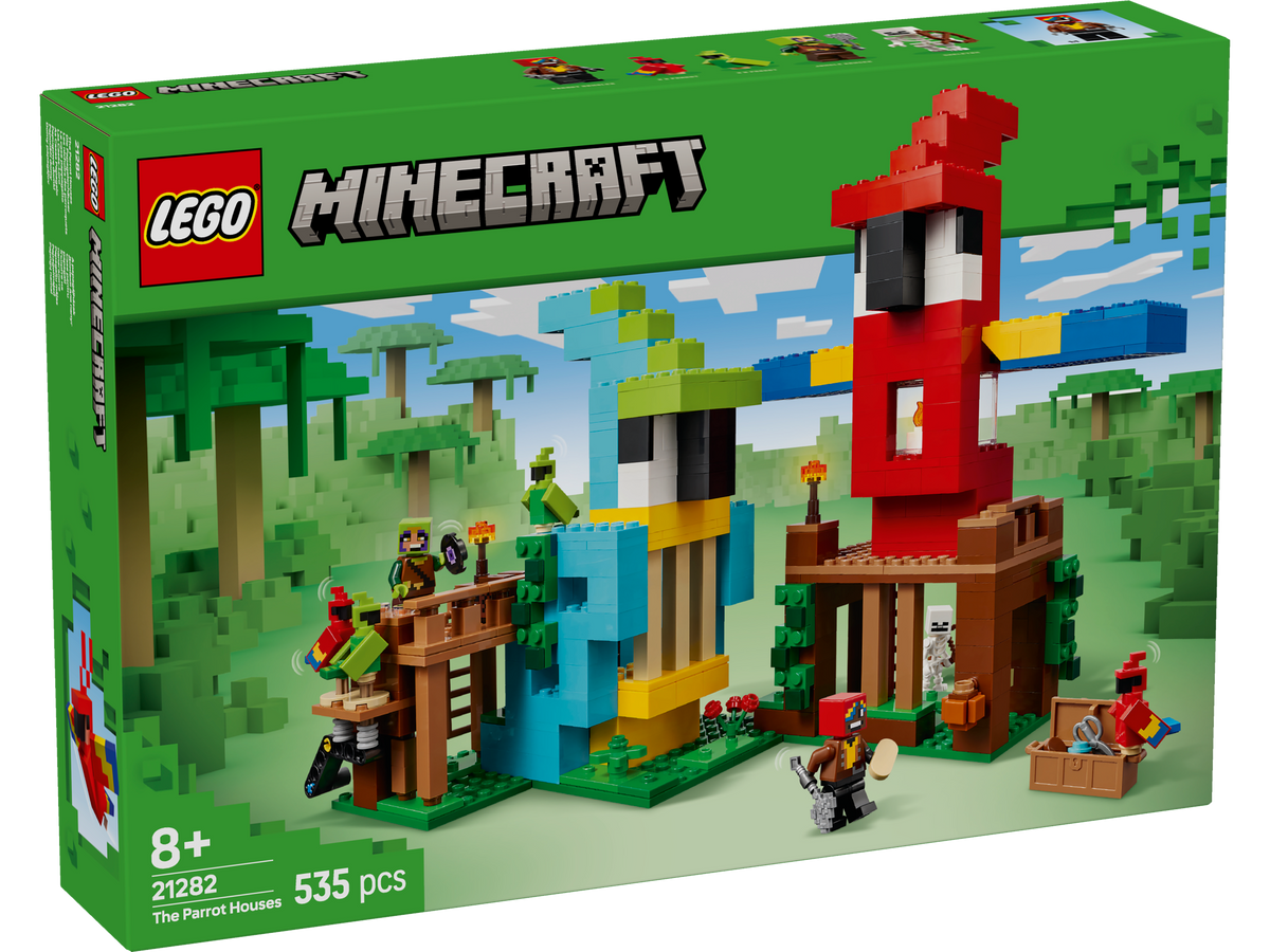 The Parrot Houses (21282) is a high-quality kids’ toy for 8-year-old boys and girls and over with a passion for the popular video game, Minecraft® toy figures and LEGO® building sets. This jungle building set includes Jungle Ranger and Parrot Handler minifigures, plus 2 red parrots, 2 green parrots and a skeleton. The buildable red parrot house features folding wings and has a storage chest and barrel inside. The parrot can be detached from the house for separate play. The buildable blue parrot house contains a jukebox with a music disc element and a function that makes the 2 parrots dance. A diamond sword, axe, chest, map, wheat seeds, coal, diamonds, cocoa beans, shears, torches and other gaming accessories inspire kids’ imaginative play. For digital fun, the LEGO Builder app lets kids zoom in, rotate models in 3D and track their progress.