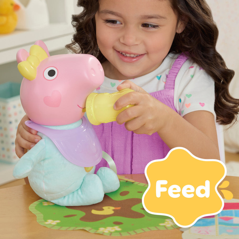 Peppa Pig's baby sister Evie is here! Kids can recreate their favourite scenes from the show with the Peppa Pig Interactive Doll Oinks & Snuggles Baby Evie Doll. It makes a great gift for kids who love the animated series or who are soon to be an older sibling! Activate over 20 different sound effects by giving her the pretend dummy or bottle, bouncing her up and down, or laying her down for pretend naptime. Cute accessories like a playmat, bib and baby blanket add to the nurturing play. Look for more Peppa Pig figures and playsets featuring Peppa's baby sister Evie (each sold separately) for more Peppa Pig family fun! Kids will love this sweet Baby Evie doll with a soft, plush body and plastic head. Play with her, feed her and lay her down to hear 20+ sound effects! Give Evie her pretend bottle and she makes adorable meal-time sounds. Bounce her up and down to hear giggles and oinks. Lay the soft baby doll down to hear a lullaby and then some snoring. Imagine jumping in muddy puddles with the muddle puddle playmat. Look out for more toys in the Peppa Pig range (each sold separately). Contents: 1x Baby Evie interactive doll, 1x pretend dummy, 1x pretend baby bottle, 1x bib, 1x baby blanket and 1x play mat. Dimensions: 28H cm. Batteries required: 2x AAA batteries (included).