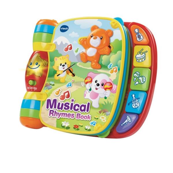 VTech Musical Rhymes Book. Interactive musical rhymes book comes to life with press piano keys that teach instrument names, sounds and colours. Includes two modes of play. Melodies of the nursery rhyme play if the instrument pressed is featured on the page of the nursery rhyme. 6 pages of bright and colourful nursery rhymes including Hey Diddle Diddle, Humpty Dumpty, Hickory Dickory Dock, Little Miss Muffet, The Mulberry Bush and Old MacDonald. Features slide and push manipulative buttons to encourage manual dexterity and discovery. Helps develop early language and reading skills. Durable plastic pages are wipe clean and non-rip so baby can play again and again.